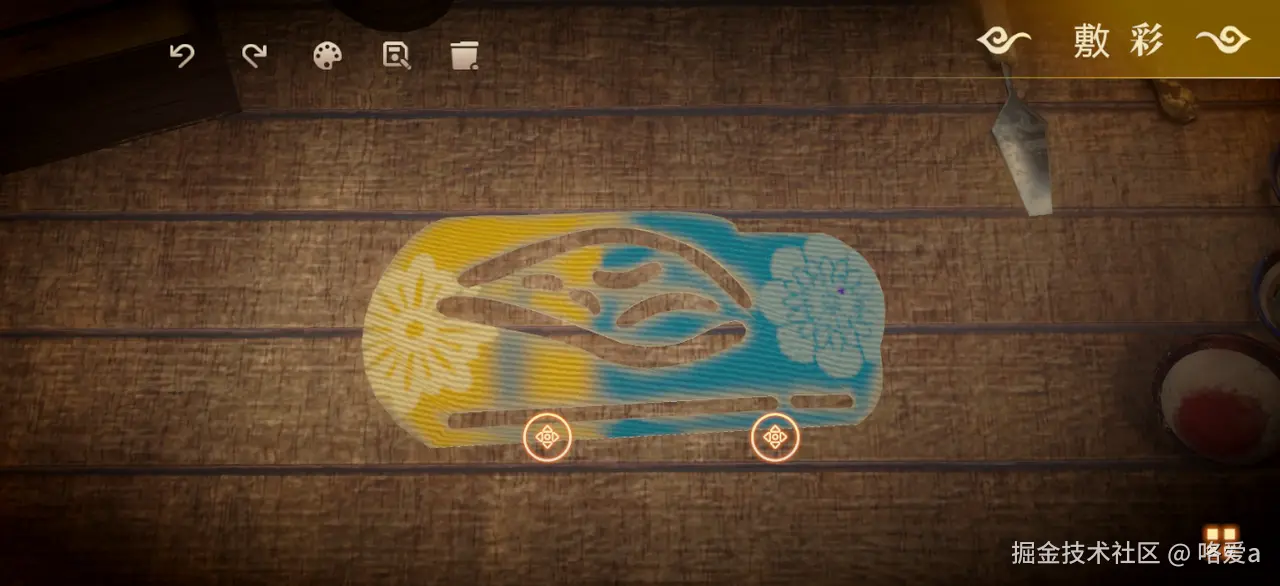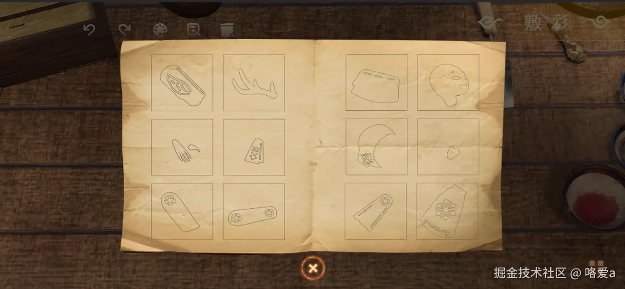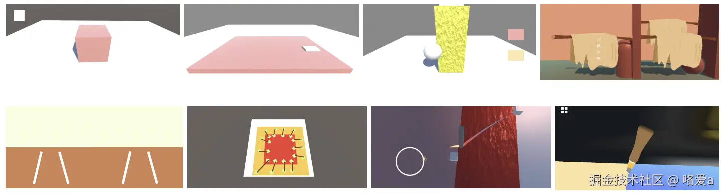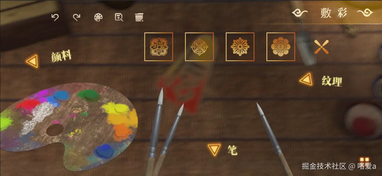 绘画模拟的原理实际上就是先给需要绘画的模型添加碰撞器,通过屏幕点击位置发射射线,当与模型碰撞后,返回当前碰撞处的贴图坐标,根据设定的笔刷大小去计算像素区域,然后根据设定的颜色覆盖其像素颜色。因此,贴图的更新和保存是关键,主要是通过Raycast碰撞MeshCollider,获取指定的textureCoord,然后将Material绘制在RenderTexture上,同时,模型的着色器需要有一个Texture参数,然后在绘制过程中,动态替换模型的纹理为绘制的纹理。由于绘制的纹理需要在其他关卡使用,因此需要做存档,即将texture数据用System.Convert.ToBase64String转为base64然后用PlayerPrefs.SetString转为字符串,然后PlayerPrefs.Save进行保存。在Awake周期函数中使用PlayerPrefs.GetString和System.Convert.FromBase64String将存储的数据读取解析。同时,画面中模拟了颜料渗透的效果,边缘逐渐模糊,能够体现出皮影的质感。