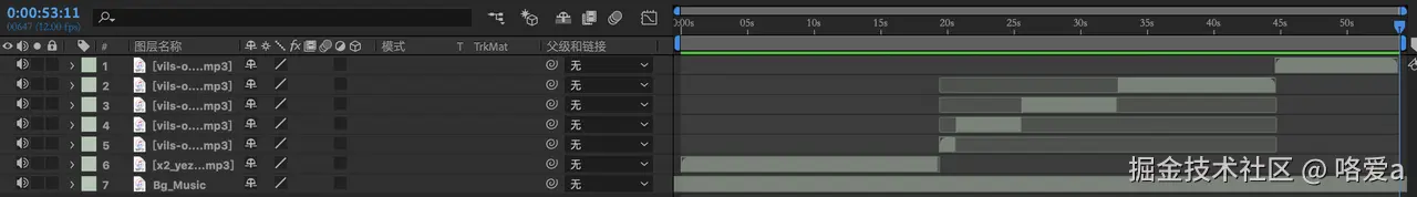 由于语音不是在线发送请求而生成的,则可以用Adobe Effects对音频再进行处理,使之更贴合游戏需要。首先将语音合成的音频和背景音乐导入Adobe Effects中,将音频拖入轨道中,即可生成对应音轨。将背景音乐的音频电平进行关键帧记录,通过查看音波的高低来判断声音的大小,将音乐一开始的音频电平设置为无声,而后设置为比合成语音略低的声音,做淡入处理,结尾部分则相反,做淡出处理。由于是合成音,有的文字部分分段并不清晰,需要手动调整。将语音音频调整好后,设置渲染输出模块为MP3,即可生成带有背景音乐的mp3文件。