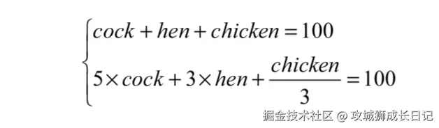 chicken= 100 -cock-hen,并且小鸡的数量chicken必须是 3 的倍数。- 条件检查:检查是否满足总钱数为 100 钱,即 5*