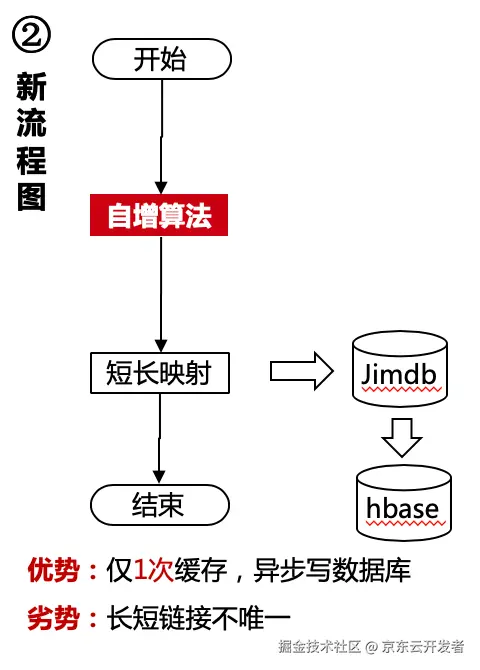 1、 系统直接采用自增算法生成了一个短码,因为自增算法没有了随机碰撞,也就不需要再检索短网址是否存在redis或hbase中。
