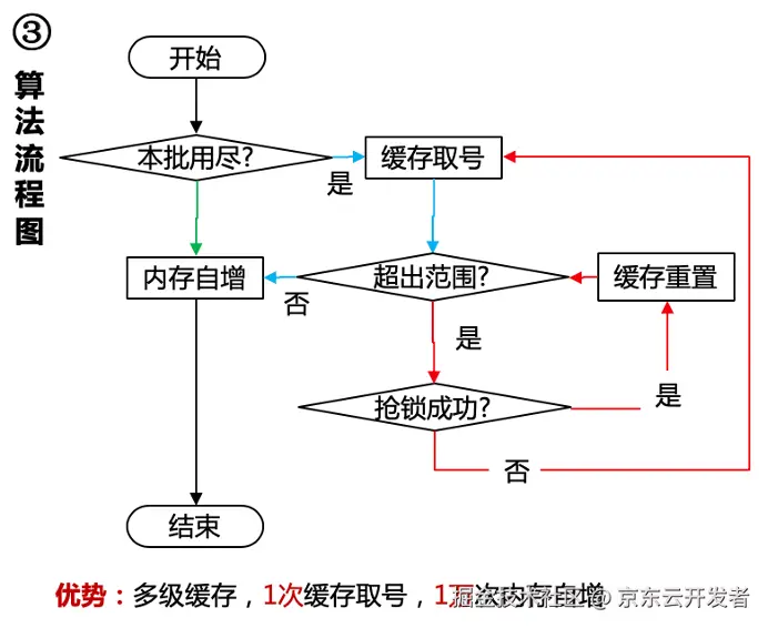 2、蓝色通道:缓存取号,依赖缓存保证分布式发号无碰撞,批量发号,每1万次内存绿色通道才走一次蓝色缓存通道取号,因此性能极高