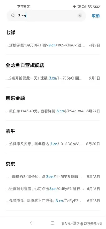 京东短网址s.3.cn/,是京东唯一的短网址服务平台,已应用到京东体系的各个业务场景中,日均产生1亿条带有3.cn的短消息,点击短网址还可直接唤起对应的APP和小程序。