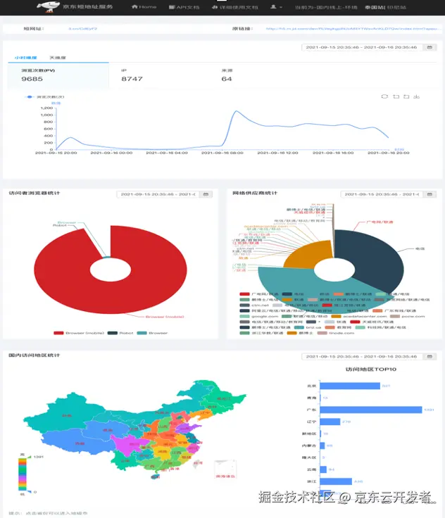 点击“分析数据”可以查看该短网址被用户打开次数的统计趋势图、访问的IP数趋势图、网络运营商占比、访问地区占比等统计,如下图2。