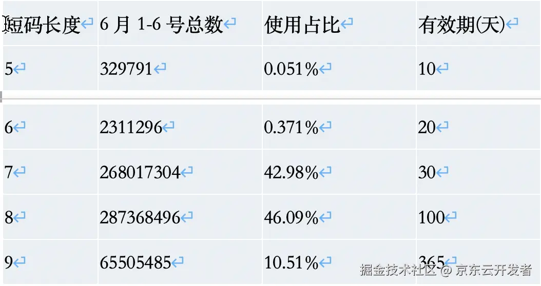 以下统计了最近6天的各短码长度的使用分布占比情况,目前使用最多的是7位与8位短码,占比总和近90%。其中43%的用户选择了30天有效期,46%的用户选择来了100天有效期。