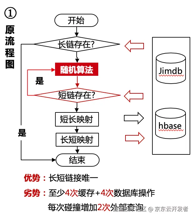 且从上面步骤5可以看出,系统存在一个碰撞循环,随着短码数据量日益增加,碰撞率也会大大增加,每次碰撞都要额外增加1次redis与1次hbase查询,导致性能越来越差。