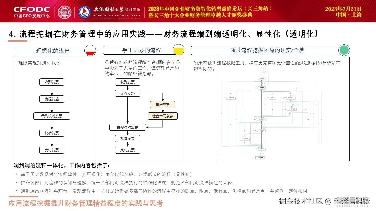 在谈到流程挖掘在财务管理中的应用实践时,针对端到端流程一体化,汪智鹏强调,流程挖掘能够基于历史数据对全流程建模并实现100%可视化,从端到端串联流程各个环节,准确还原真实财务运营全貌,这有助于企业发现流程中存在的断点、阻点、低效点、失控点和异常点,并侦测、定位根因,“提升端到端流程视角,不光要有意识,更要靠系统和工具。如果不使用流程挖掘,拥有更完整和更全面性的过程映射和分析是不切实际的。”