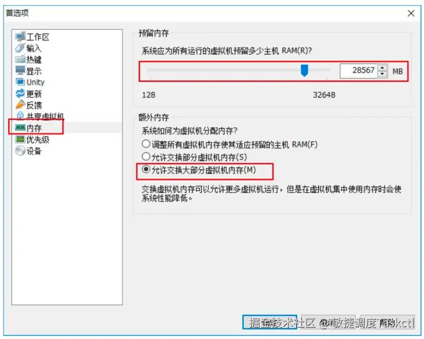 在 VMware 中点击“编辑”->“首选项”,找到内存,预留内存是给当前真实物理 机预留的内存量。在额外内存中,如果实际物理机内存不足 10G 就设置“允许交换大部分虚拟机内存”,设置这个的意思是当虚拟机内存不足时,可以允许内存与磁盘交换数据,从而获取更多的内存执行当前运行的程序。
