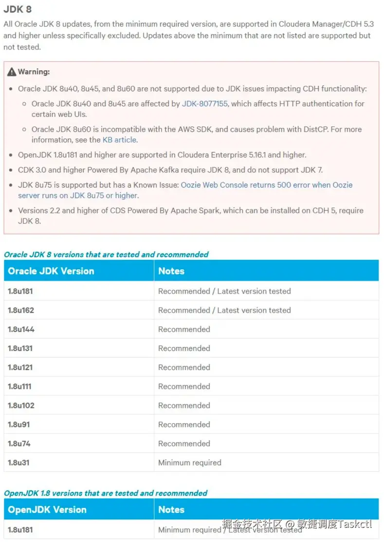 给每台节点安装 jdk,这里我们安装的 CDH 版本为 5.4,在官网www.cloudera.com/documentati… otes/topics/rn_consolidated_pcm.html 下有介绍 版本对应的 jdk 版本,可以使用 jdk7,也可使用 jdk8,但是对应的 jdk 小版本有要求,具体如下:
