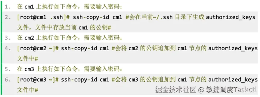 第四、将 cm1,cm2,cm3 的公钥 copy 到 cm1 上,这样,cm1,cm2,cm3 节点都能登录 cm1 节点。命令如下: