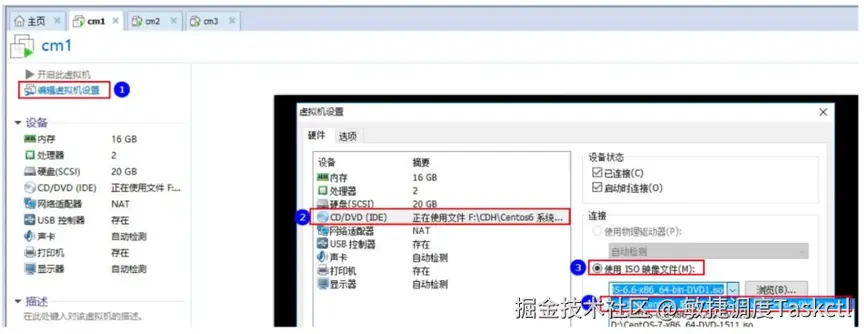 这里我们选择使用本地 yum 源。需要在 VM 中设置下连接光驱,步骤如下图: