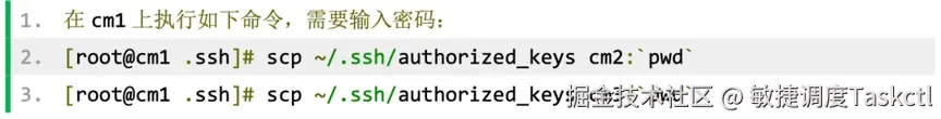 最后、将 cm1 节点上~/.ssh/authorized_keys 拷贝到 cm2 和 cm3 节点的 ~/.ssh/目录下,执行如下命令: