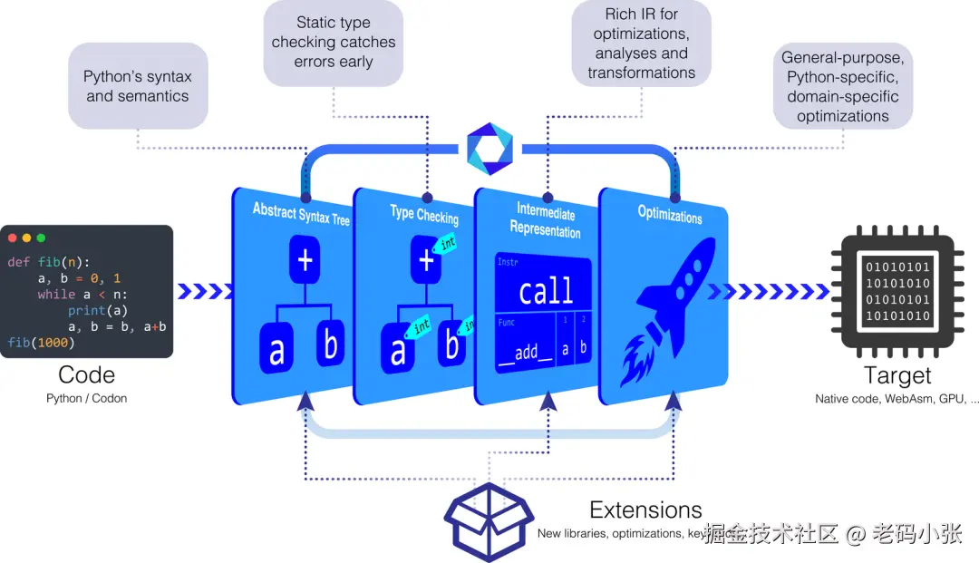 Codon 的背后是 LLVM 这个强大的编译框架。LLVM 的全称是 "Low Level Virtual Machine",是一个现代编译器基础设施,支持多种编程语言的优化和编译。它不仅帮助 Codon 高效地生成机器码,还能对代码进行高级优化,比如减少冗余操作、优化内存访问等。对于 Python 开发者来说,使用 Codon 编译你的代码,就相当于让你的代码得到了 LLVM 的性能优化加持。