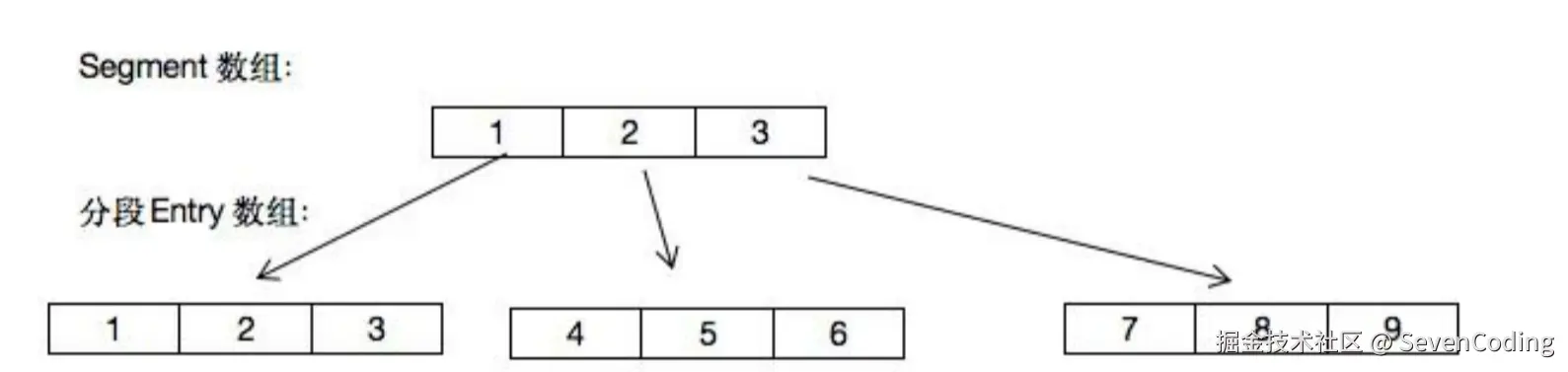 段Segment继承了重入锁ReentrantLock,有了锁的功能,每个锁控制的是一段,如下图所示: