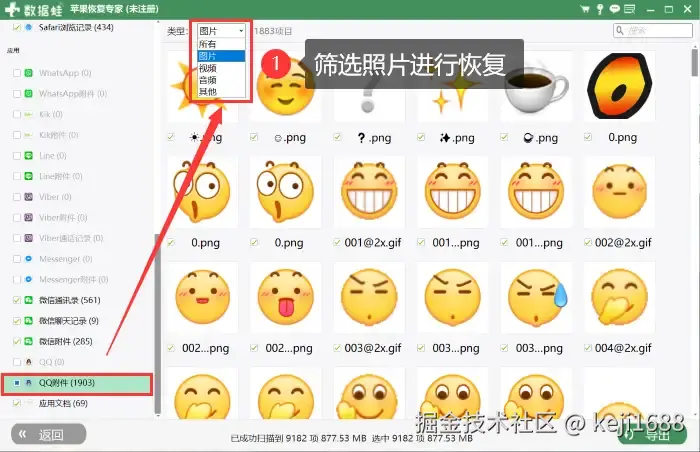 步骤3:在扫描结果中,点击 【QQ附件】 选择需要恢复的照片,恢复成功后导出到指定的位置即可。