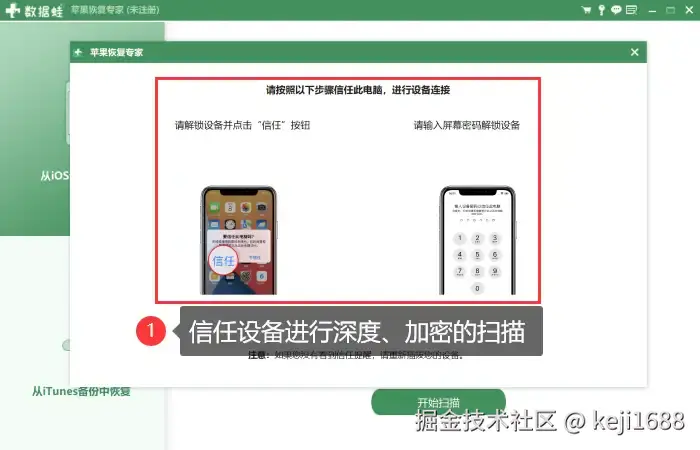 步骤1:在电脑上启动苹果恢复专家,使用USB数据线将手机连接到电脑,选择合适的模式进行扫描。