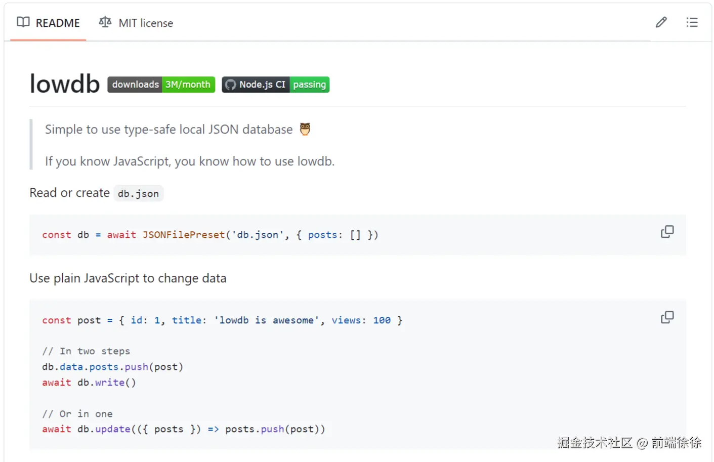 - 简单易用: lowdb 的 API 设计简洁直观,上手非常容易。