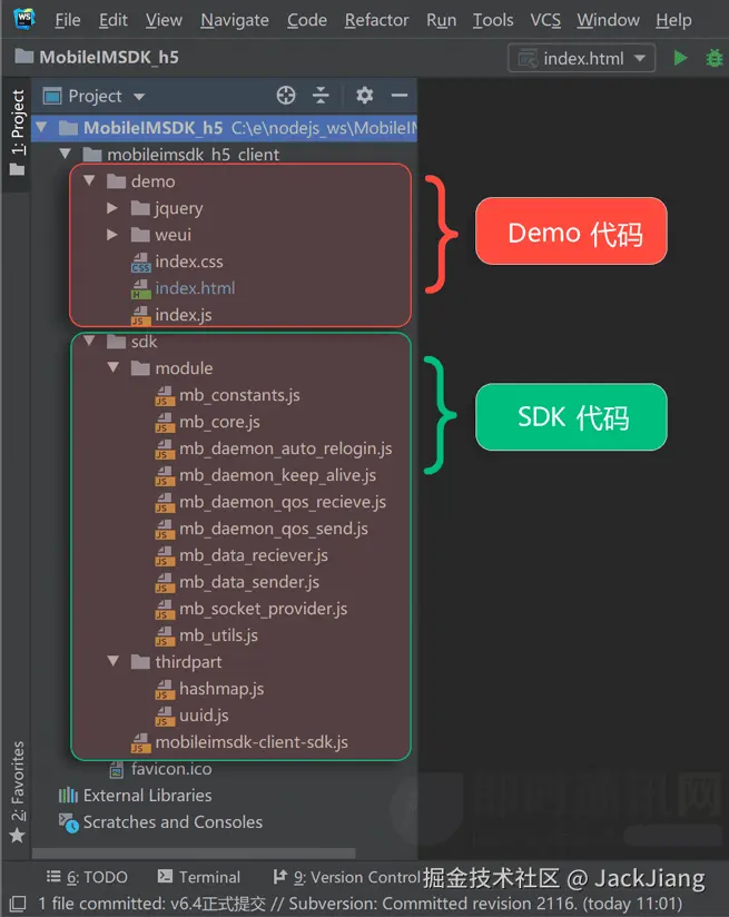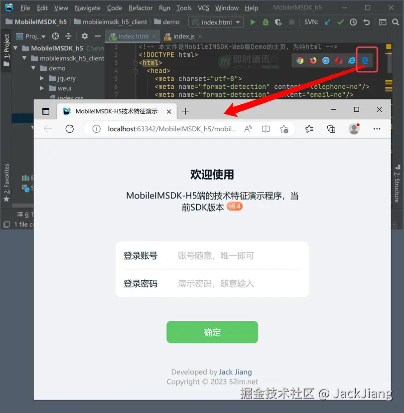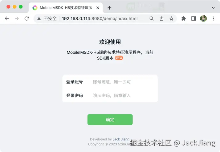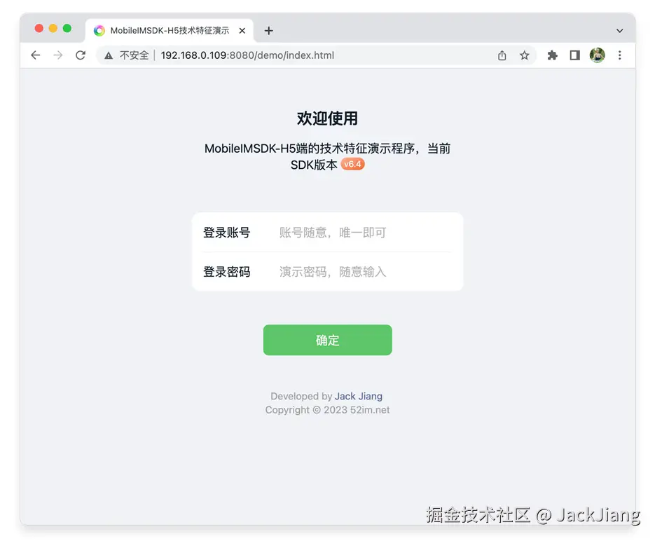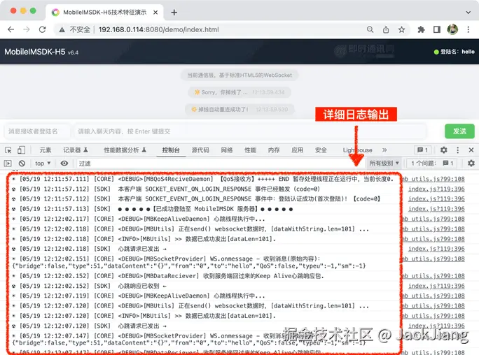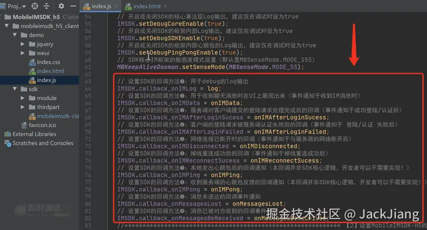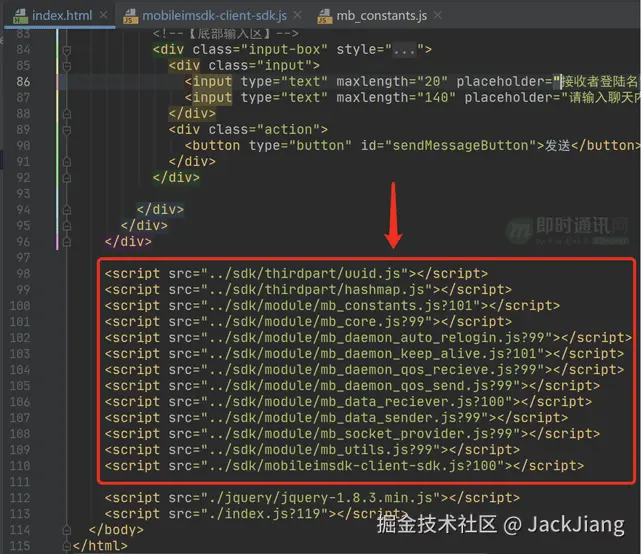 MobileIMSDK-H5端SDK本身只是JS文件源码的集合,本工程中自带的前端Demo的目的只是为了方便随时测试MobileIMSDK-H5端的SDK代码而已,在此工程中的使用也仅仅只涉及了一个主Demo页面而已。