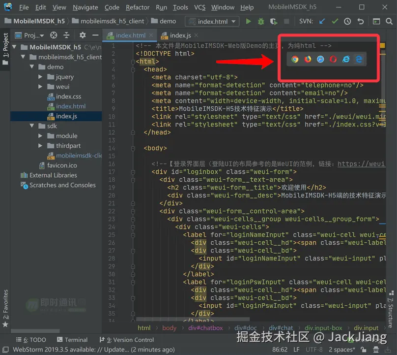 **特别说明:**MobileIMSDK的H5端(包括Demo在内),全部是静态的HTML+JS资源,可以通过WebStorm自带的HTML页面预览功能,直接自动加载到电脑的浏览器中运行和预览。