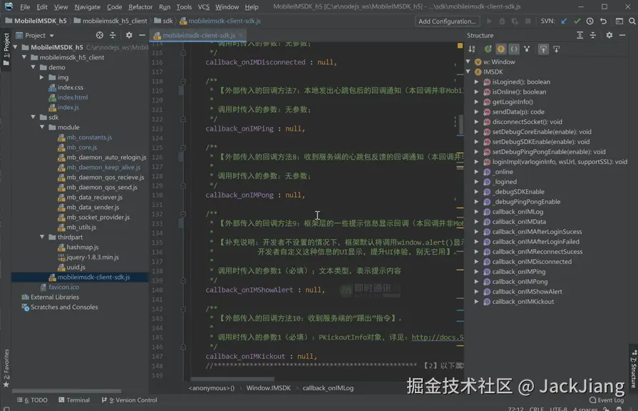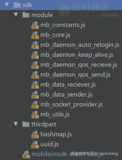 **如下图所示:**所有 SDK 接口均由/mobileimsdk/mobileimsdk-client-sdk.js 提供。,接口设计跟MobileIMSDK 的APP版一样,均为高内聚和低侵入的回调方式传入SDK处理逻辑,无需(也不建议)开发者直接修改sdk级代码。