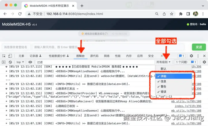 原因是浏览器控制台下的日志级别默认进行了过滤,勾选所有日志级别,就能看到SDK的详细日志输出了。