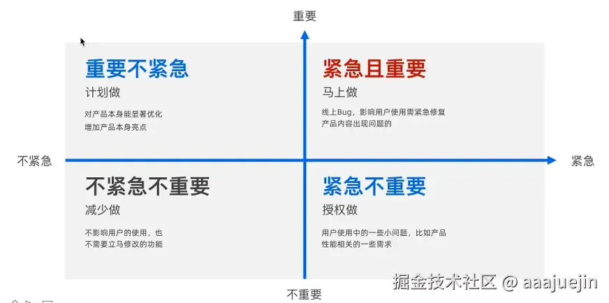 不紧急不重要:减少做。 不影响用户的使用,也不需要立马修改的功能