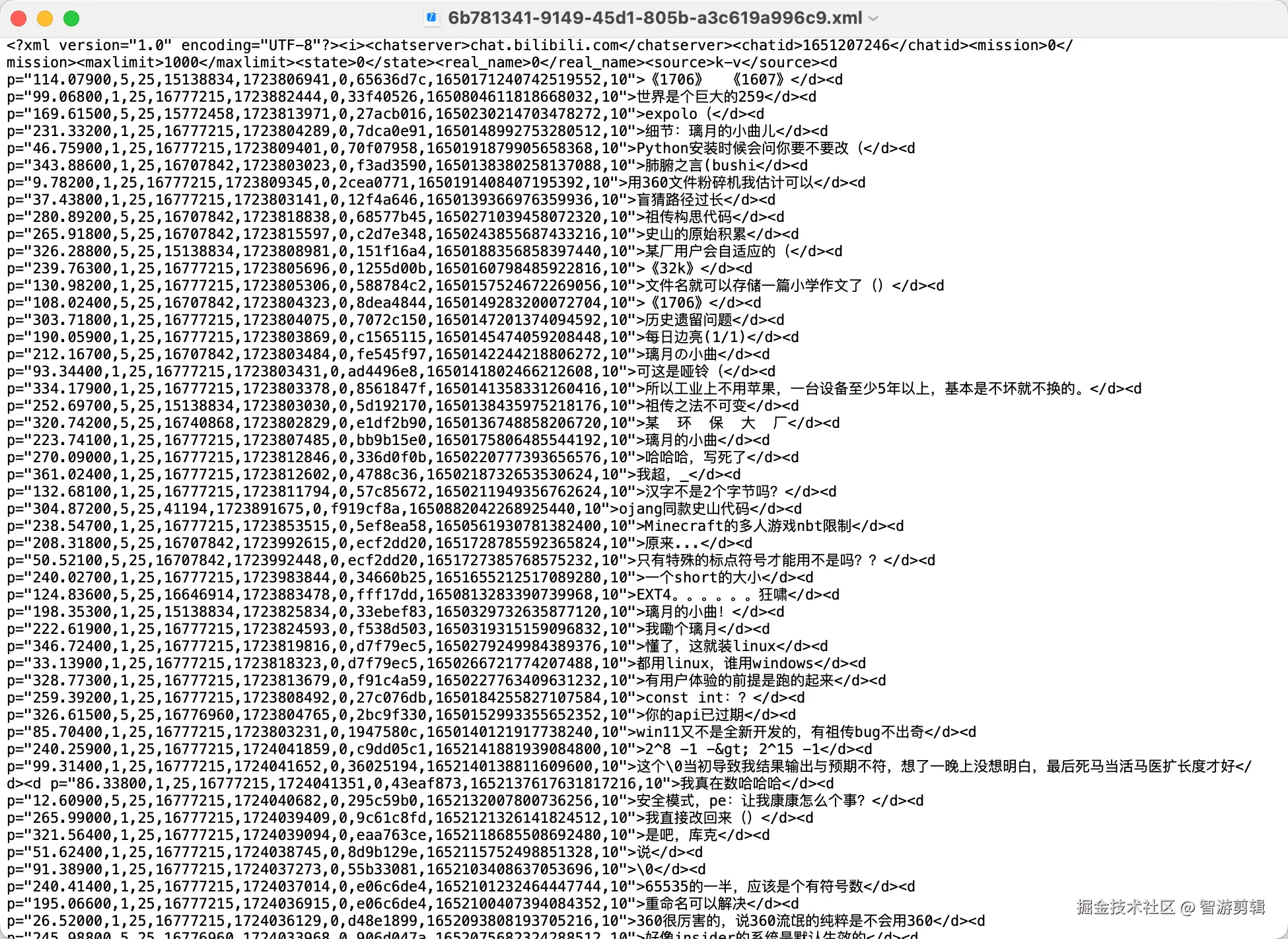 B站弹幕下载 智游剪辑 2024-09-20 392 阅读1分钟 弹幕是一种实时评论形式,通常用于视频直播或播放平台,B站作为国内最大的弹幕网站,很多视频上都有很多有意思的弹幕,下面给大家介绍一下如何下载某个视频的弹幕信息 使用说明 打开智游剪辑(zyjj.cc),搜索B站弹幕下载 我们只需要粘贴一下B站的视频链接,点击提交就可以了 最后返回的弹幕文件是xml格式,大家可能需要手动解析一下 效果预览