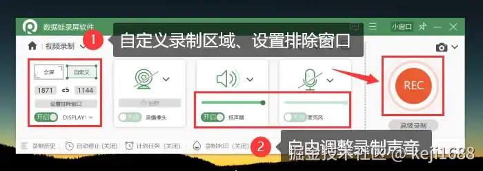 第三步:在 【视频录制】 界面,我们可以自定义录制区域并设置排除窗口,在录制过程中保护好您的个人隐私。并可以自由调整录制声音,点击 【REC】 按钮进行录制。电脑怎么录屏按哪个键?也可以使用快捷键 【Alt+S】 进行快速录制。