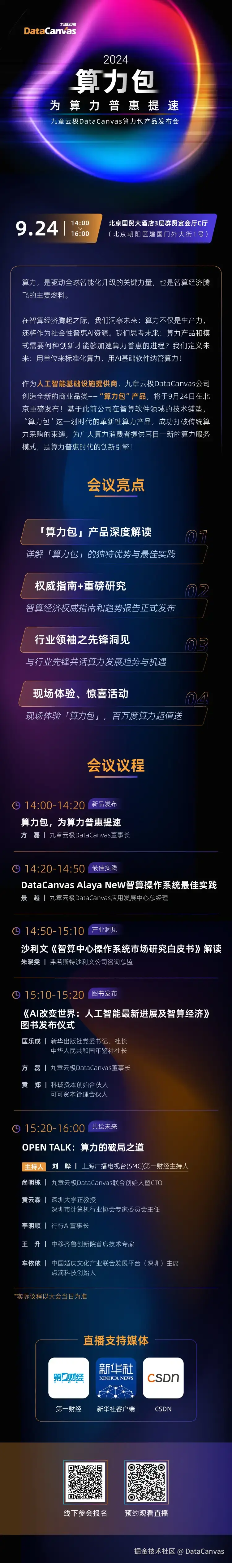 诚邀您莅临“算力包,为算力普惠提速·2024九章云极DataCanvas算力包产品发布会”,这将是一场前所未有的算力创新盛会,我们期待与您一同探讨面向未来的算力服务模式,解读最前瞻的智算产业趋势,共同开启算力新时代!
