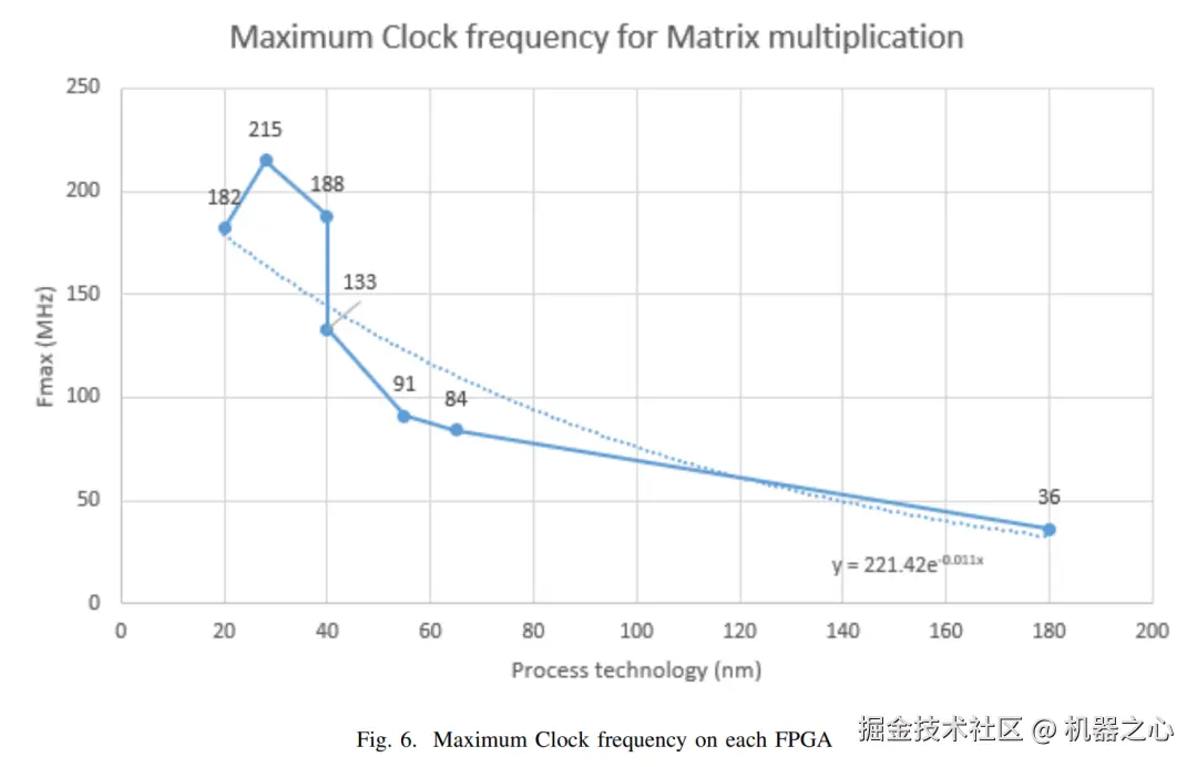 本文针对 FPGA 架构进行了实验外推,并测试了 20nm、28nm、40nm、 55nm、65nm 和 180nm 工艺下技术不同的矩阵乘法代码,以验证 16nm 工艺的理论转换效果。研究者表示,FPGA 技术上的矩阵乘法结果有助于外推不同硬件加速器在相同工艺技术上的结果。