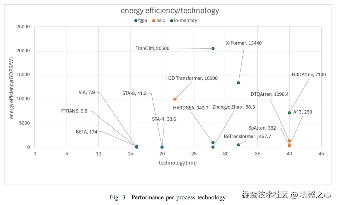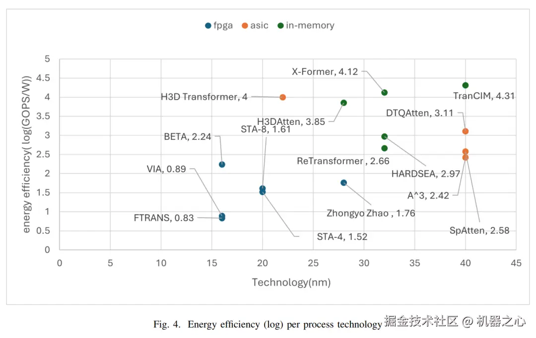 下表 I 列出了目前所有的硬件加速器以及各自的主要特性,包括加速器名称、加速器类型(FPGA/ASIC/In-memory)、性能和能效。