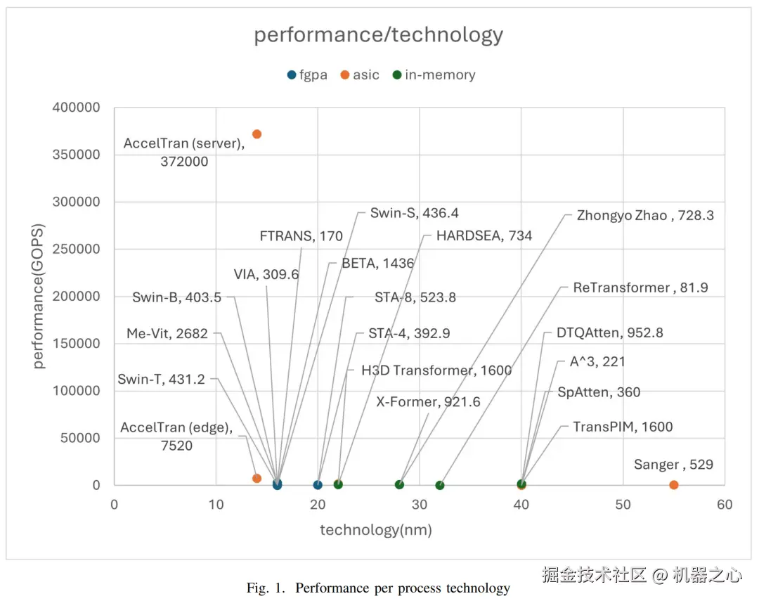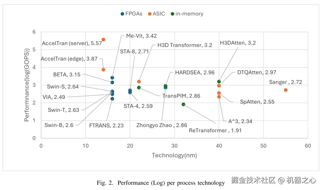下图 1 展示了不同工艺技术下,每种加速器的性能;图 2 展示了更加清楚的对数尺度性能。