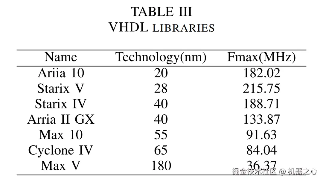 下表 III 展示了不同 FPGA 设备、工艺技术以及矩阵乘法 IP 核的结果。