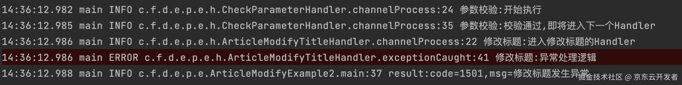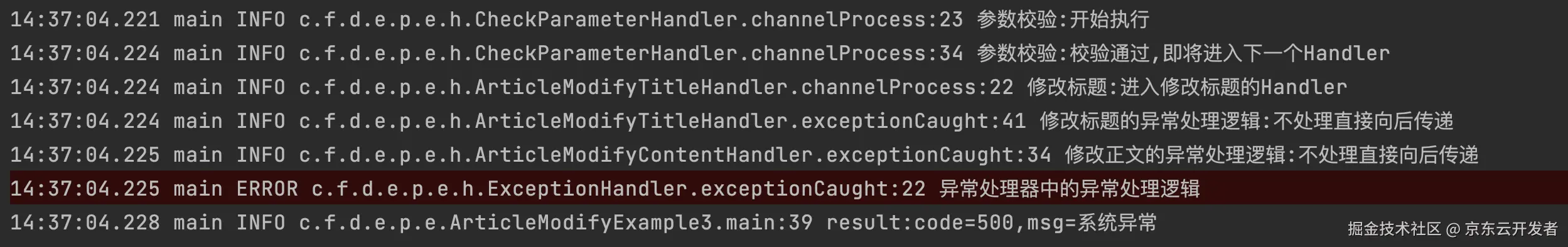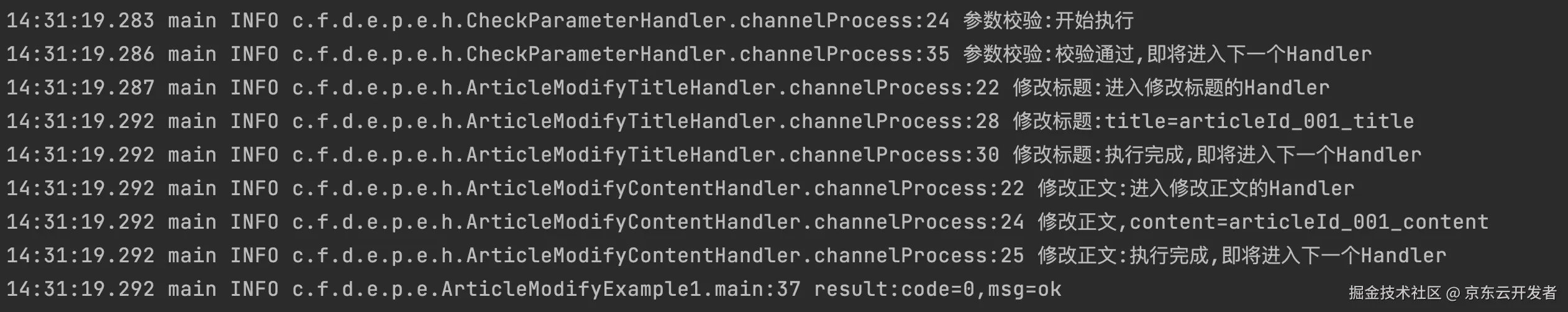 以下是运行 ArticleModifyExample1 的 main 方法打出的日志,可以看到我们定义的 handler 被逐个执行了。