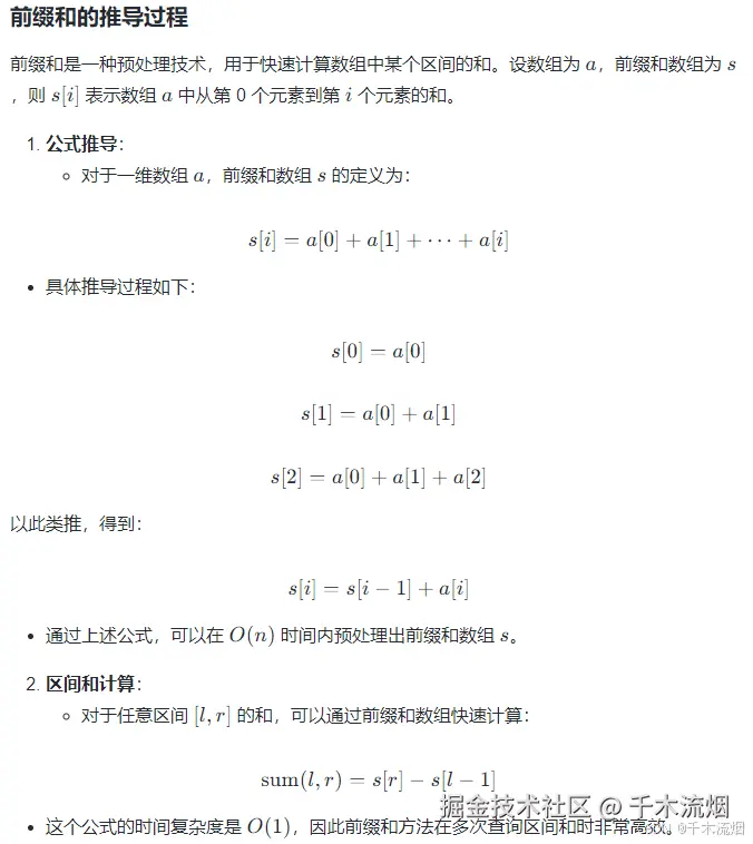 前缀和的主要优点在于能够快速计算任意区间的和,而不需要遍历整个区间内的所有元素。这大大降低了时间复杂度,常用于解决子数组最大和、区间求和等问题。