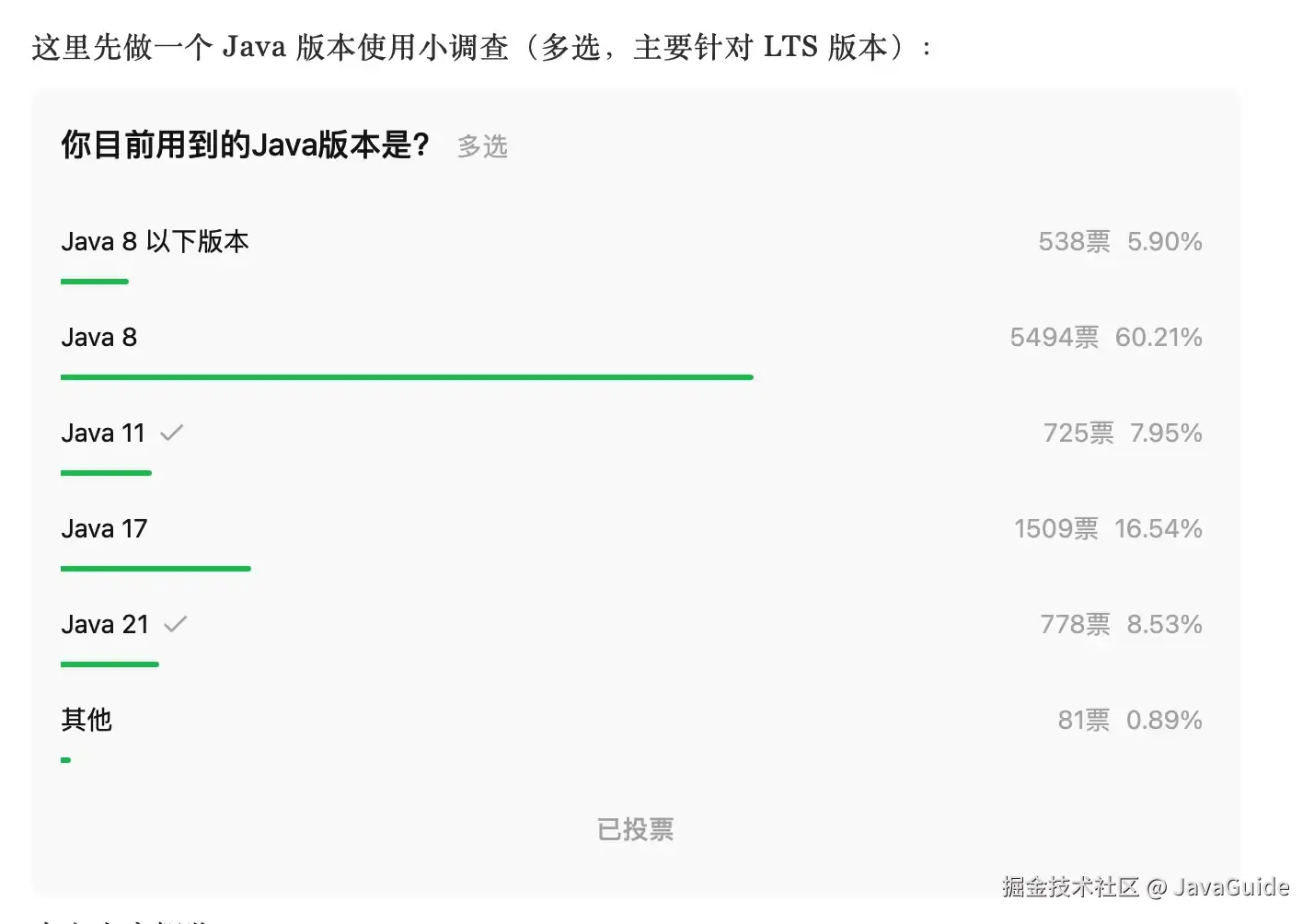 下面是我做的一个小调查,从调查结果来看,还得是 Java8 硬呀!