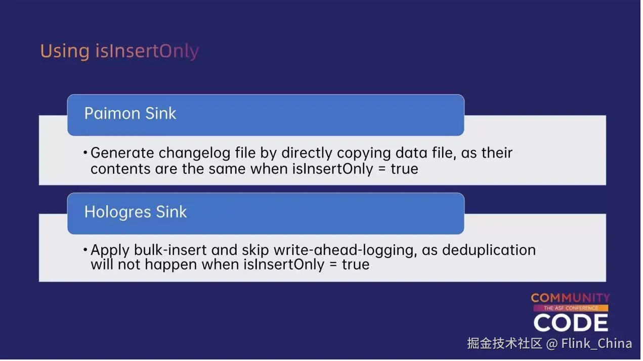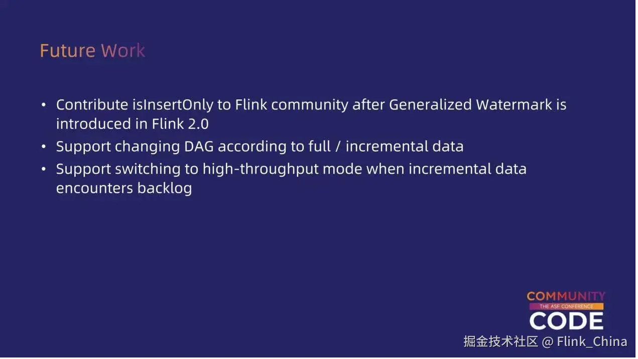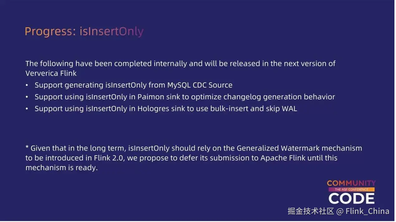 关于 isInsertOnly,前面介绍到的内容,包括从 CDC(Change Data Capture)收集 isInsertOnly 信号,并利用该信号优化 Paimon Sink 和 Hologres Sink的部分,这些功能已经在阿里云商业化版本的 Flink 中完成,并预计将在下个版本发布。