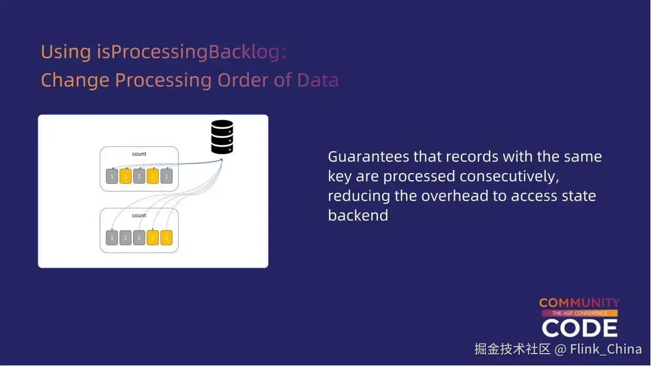 具体来说,当 isProcessingBacklog 为 true 时,下游算子会先暂停消费数据,然后对上游积压的数据进行排序。排序完成后,算子再对相同主键的数据进行连续消费。这样不仅不会明显增加数据延迟,还通过减少随机访问状态后端的开销,优化了作业的整体吞吐量。