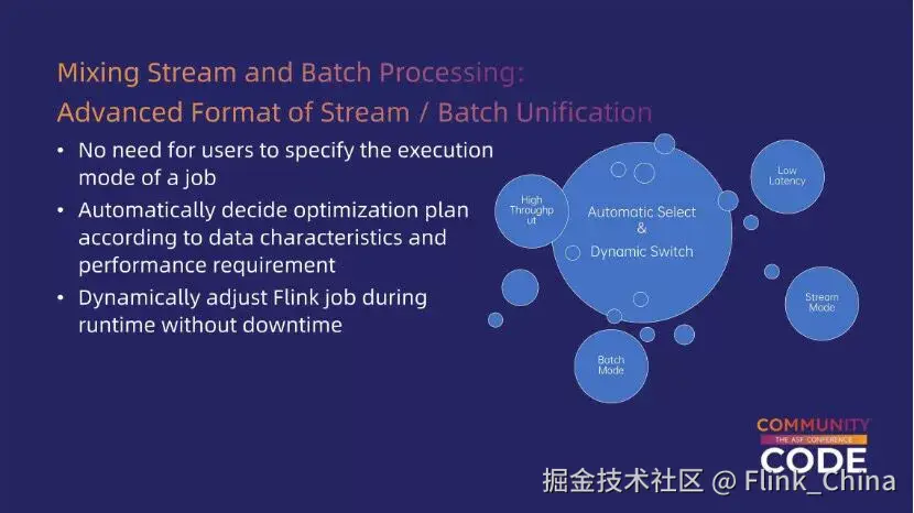 基于以上对前提条件和场景的分析,我们可以看到,流批融合想要实现的目标是使用户不再需要手动配置流模式或批模式,而是通过 Flink 框架自动检测用户在不同场景下(实时和离线)对吞吐量、延迟以及数据特征的需求,动态地进行相应的优化。这使得 Flink 能够根据用户对吞吐量和延迟的倾向性,以及数据特征的变化,自动调整优化策略。