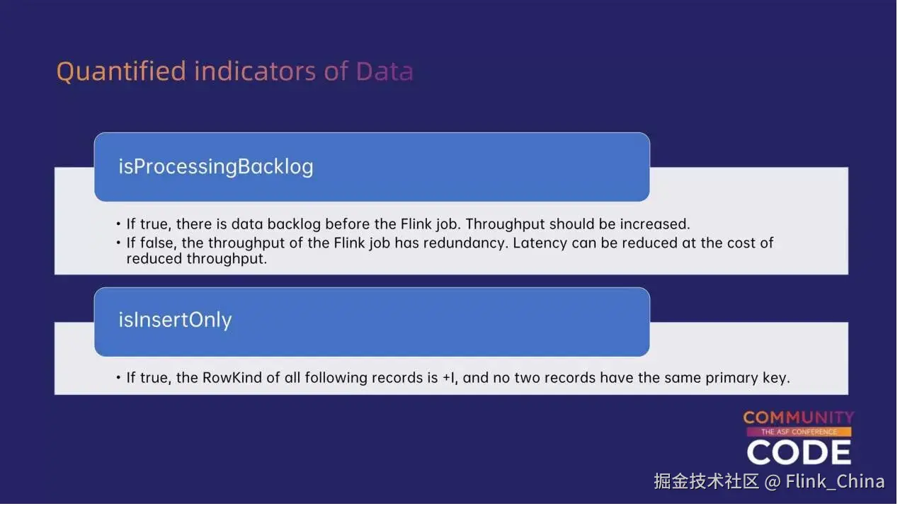 第一个指标是 isProcessingBacklog,可以理解为用于判断当前是否存在数据积压。当出现数据积压时,作业需要在最短时间内处理这些积压数据。这时,作业可以通过牺牲延迟来优化,从而提高吞吐量。在没有数据积压的情况下,作业应该像现有的流模式那样,尽量保证低延迟和高数据新鲜度的目标。
