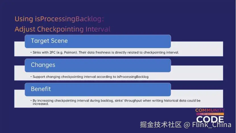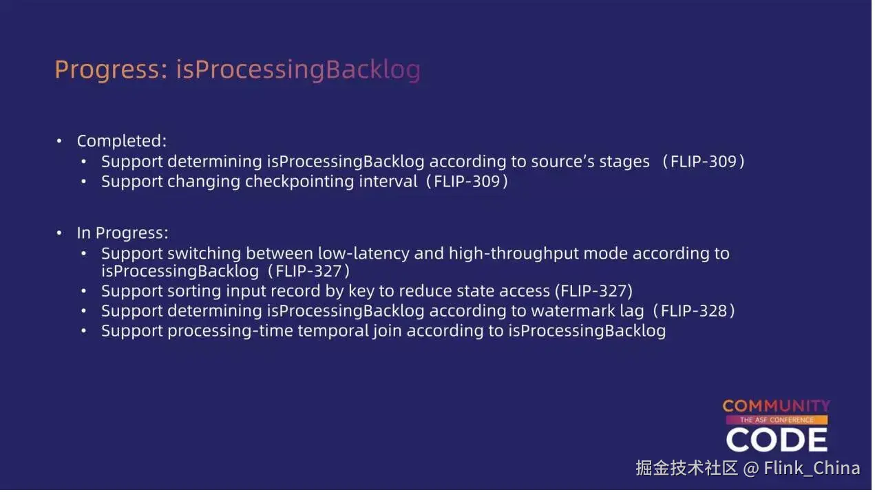 首先,关于 isProcessingBacklog,目前社区已经完成了根据 source 的不同阶段生成 isProcessingBacklog 信号,并将这个信号传递到下游、用它来调控 Flink 的 checkpoint 时间间隔的部分。对于前面提到的对所有数据进行排序以减少状态开销、以及根据 watermark 的延迟来判断 isProcessingBacklog 的功能,它们已经在社区中提出讨论,但还没有最终完成。这里每个条目后都有对应的 Flink 设计文档编号,感兴趣的读者可以参考相关的具体设计文档。