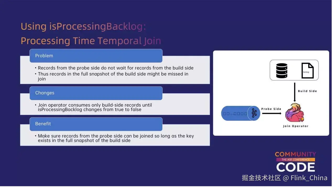 首先,对于 isProcessingBacklog,优化措施之一是更好地支持基于处理时间的临时连接(Processing Time Temporal Join)。这种 Join 不依赖于 Probe Side 和 Build Side 数据本身的时间因素,而是依赖于系统时间。当Probe Side数据到达Flink系统时,根据当前最新的 Build Side 数据做 Join 即可。