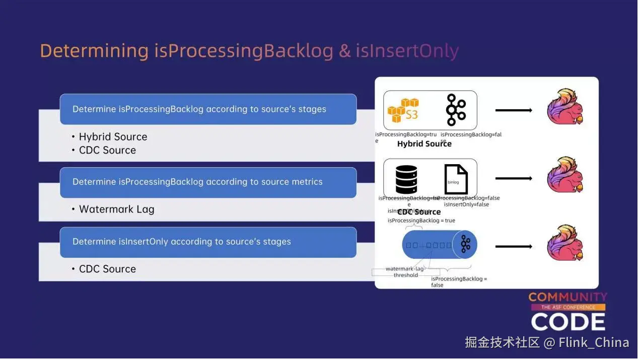 前面介绍了判断 isProcessingBacklog 的方法。而对于判断 isInsertOnly 的方式,目前主要支持 CDC source。在全量阶段,isInsertOnly 等于 true,而在增量阶段,isInsertOnly 等于 false。