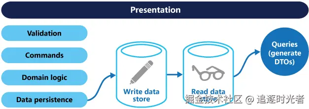 - Queries(查询):查询对象被传递给查询处理器,查询处理器直接从读数据存储中获取数据,并生成DTOs返回给展示层。