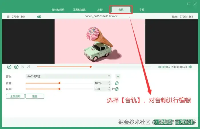 第三步: 在转换格式之前,如果你发现视频中有杂音或者需要进行剪辑,可以利用编辑功能进行剪切或添加新的音轨。