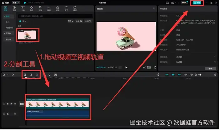 第二步: 把视频文件拖动到视频轨道中。如果只需要导出视频中的某一部分音频,可以使用剪映的分割工具将视频分割成多个部分,并只选择需要的那部分,删除多余的视频片段。