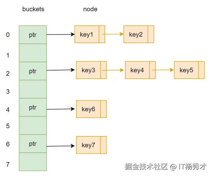 拉链法是一种最常见的解决哈希冲突的方法,很多语言都是用拉链法哈希冲突。拉链法的主要实现是底层不直接使用连续数组来直接存储数据元素,而是使用通过数组和链表组合连使用,数组里存储的其实是一个指针,指向一个链表。当出现两个key比如key1和key2的哈希值相同的情况,就将数据链接到链表上,如果没有发现有冲突的key,显然链表上就只有一个元素。拉链法处理冲突简单,可以动态的申请内存,删除增加节点都很方便,当冲突严重,链表长度过长的时候也⽀持更多的优化策略,⽐如⽤红⿊树代替链表。 拉链法结构如下图: 左边为一个连续数组,数组每个元素存储一个指针,指向一个链表,链表里每个节点存储的是发生hash冲突的数据