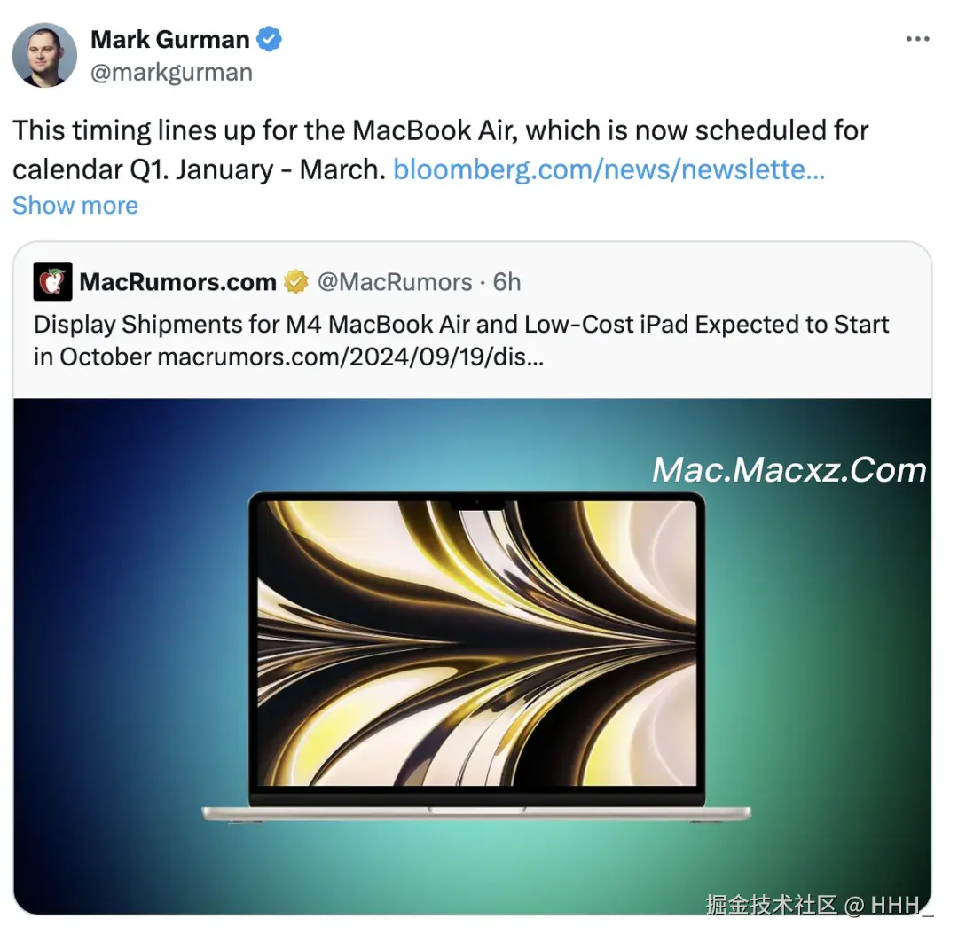 9 月 20 日最新消息屏幕供应链咨询公司 DSCC 首席执行官罗斯・杨(Ross Young)昨日(9 月 19 日)在 X 平台面向其订阅用户发布推文,透露苹果 M4 MacBook Air 与低成本 iPad 的屏幕预估将于今年 10 月开始出货。