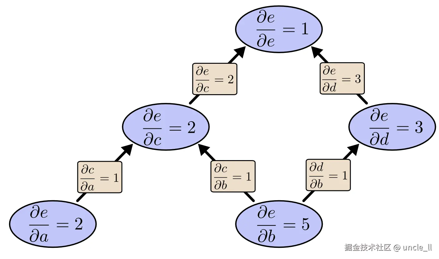 一般规则是,从一个节点到另一个节点的所有可能路径求和,将路径上每条边上的导数相乘。例如,要得到 e 相对于 b 的导数,我们计算: