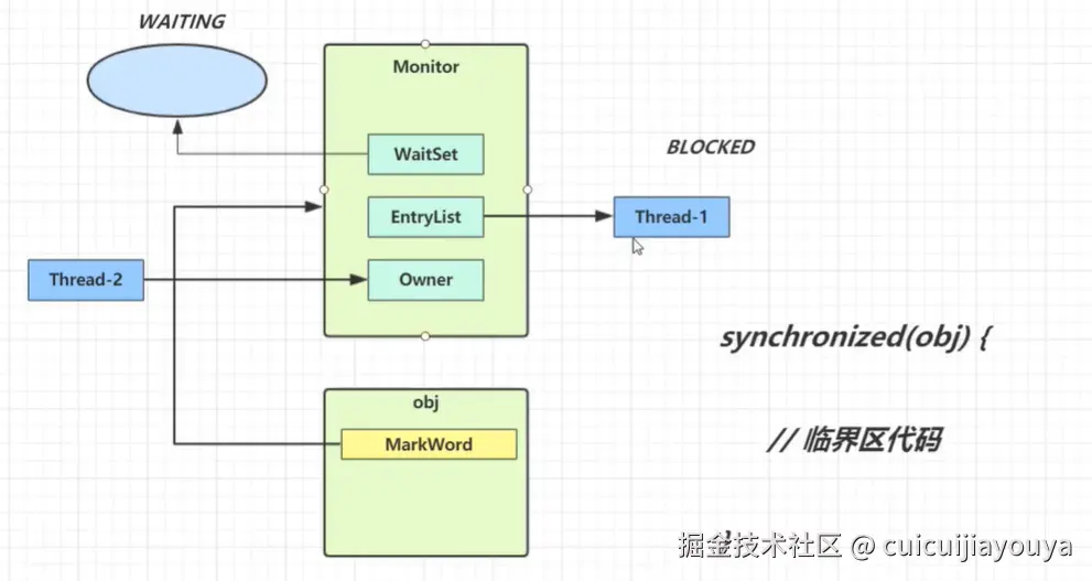 - 当 Thread-2 执行 synchronized(obj) 就会将 Monitor 的所有者 Owner 置为 Thread-2,Monitor 中只能有一个 Owner,obj 对象的 Mark Word 指向 Monitor,把对象原有的 MarkWord 存入线程栈中的锁记录中(轻量级锁部分详解)
