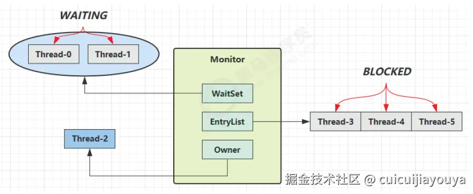 - WaitSet 中的 Thread-0,是以前获得过锁,但条件不满足进入 WAITING 状态的线程(wait-notify 机制)